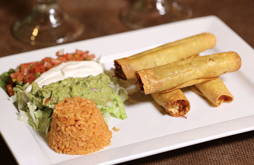 Deep fried flour tortilla stuffed with chicken or beef, served with rice, beans, sour cream and tomato.