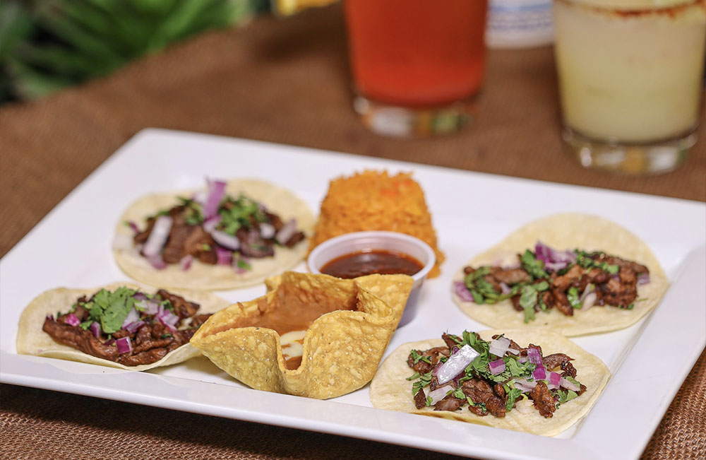 Try the original taco, made with tender grilled steak or chicken, on your choice of soft corn or flour tortillas. Topped with cilantro and onions. Served with rice, choice of black or refried beans.