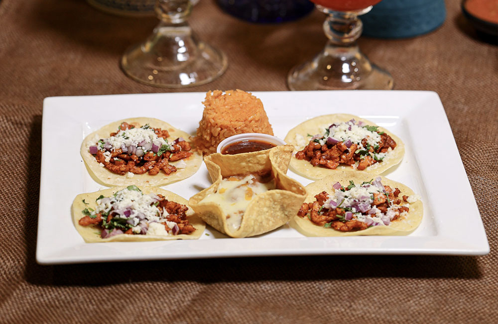(3 Tacos) Grilled shrimp cooked with a hint of tequila and fresh squeezed lime juice, sautéed in red cabbage. Served with black beans and rice.