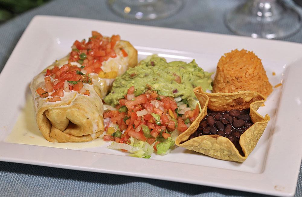 A great mix of crab meat* and shrimp rolled into a large 12” tortilla and deep fried until golden. Topped with cheese sauce and pico de gallo. Side of rice, black beans, sour cream and tomato.