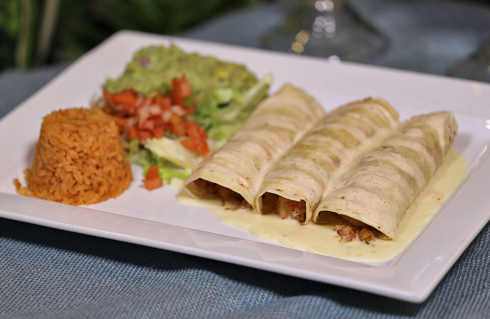 A mix of crab meat* and shrimp rolled into three flour tortillas. Topped with melted cheese and our secret sauce. Side of rice, lettuce & pico de gallo.